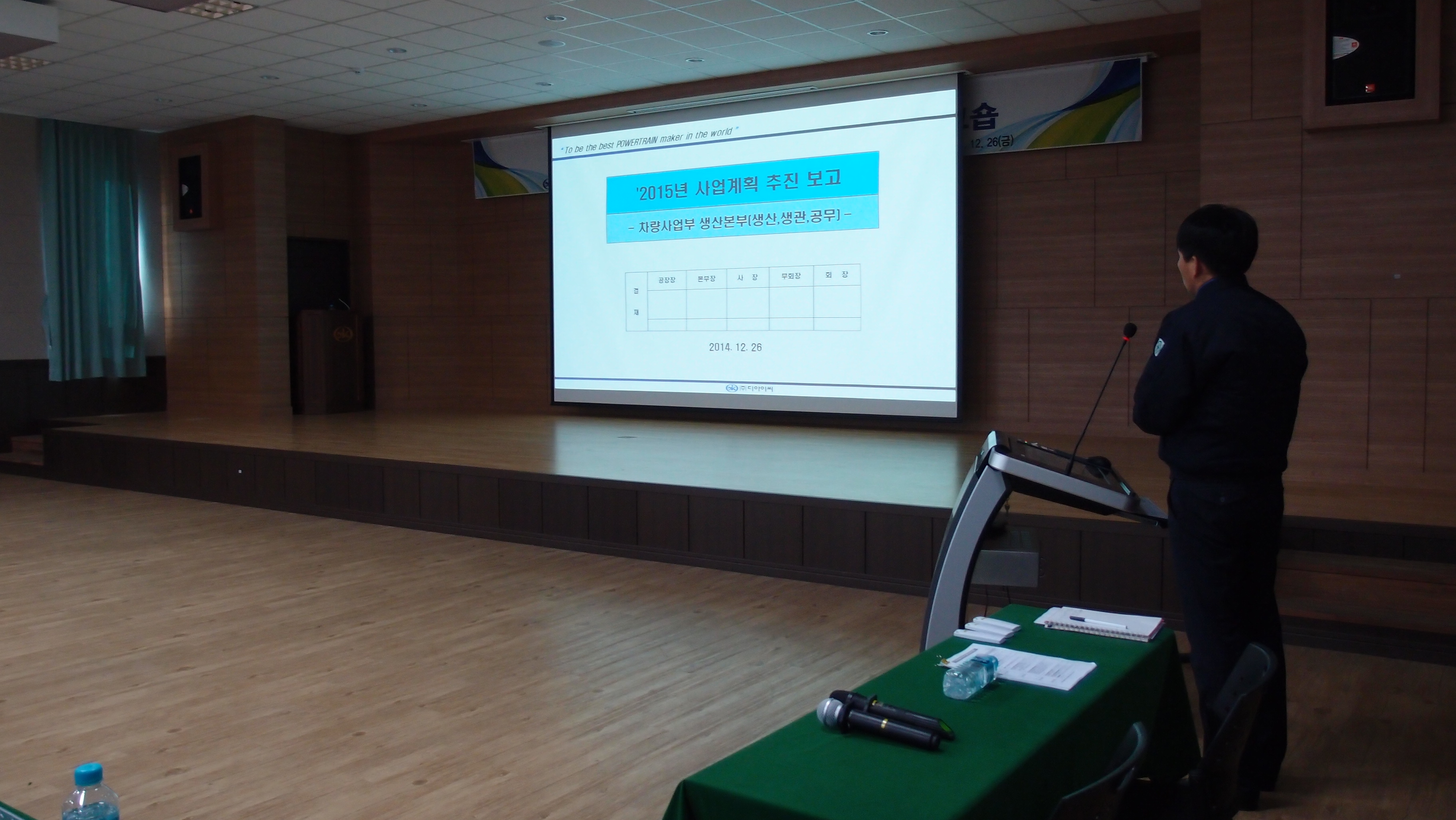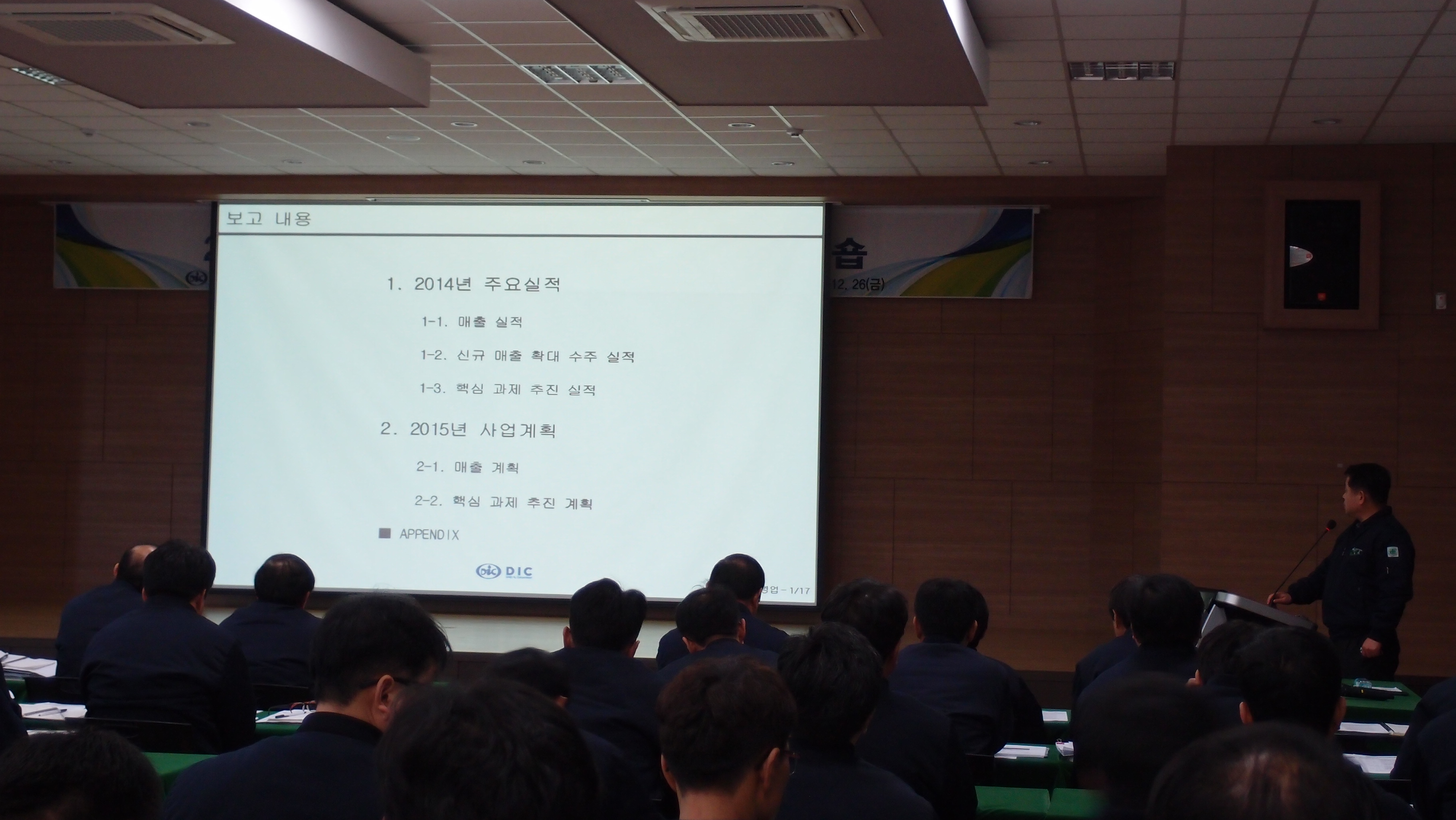 1. 일정 : '14년 12월 26일(금) 2. 대상 : 디아이씨 및 그룹 계열사(대일이노텍,대호) 과장급 이상 간부사원 약 100명 3. 장소 : 연수원 3층 대강당 4. 진행 : 본부별 사업계획 보고 및 외부강사 특강 5. 사업계획 보고(발표) : 각 부서별